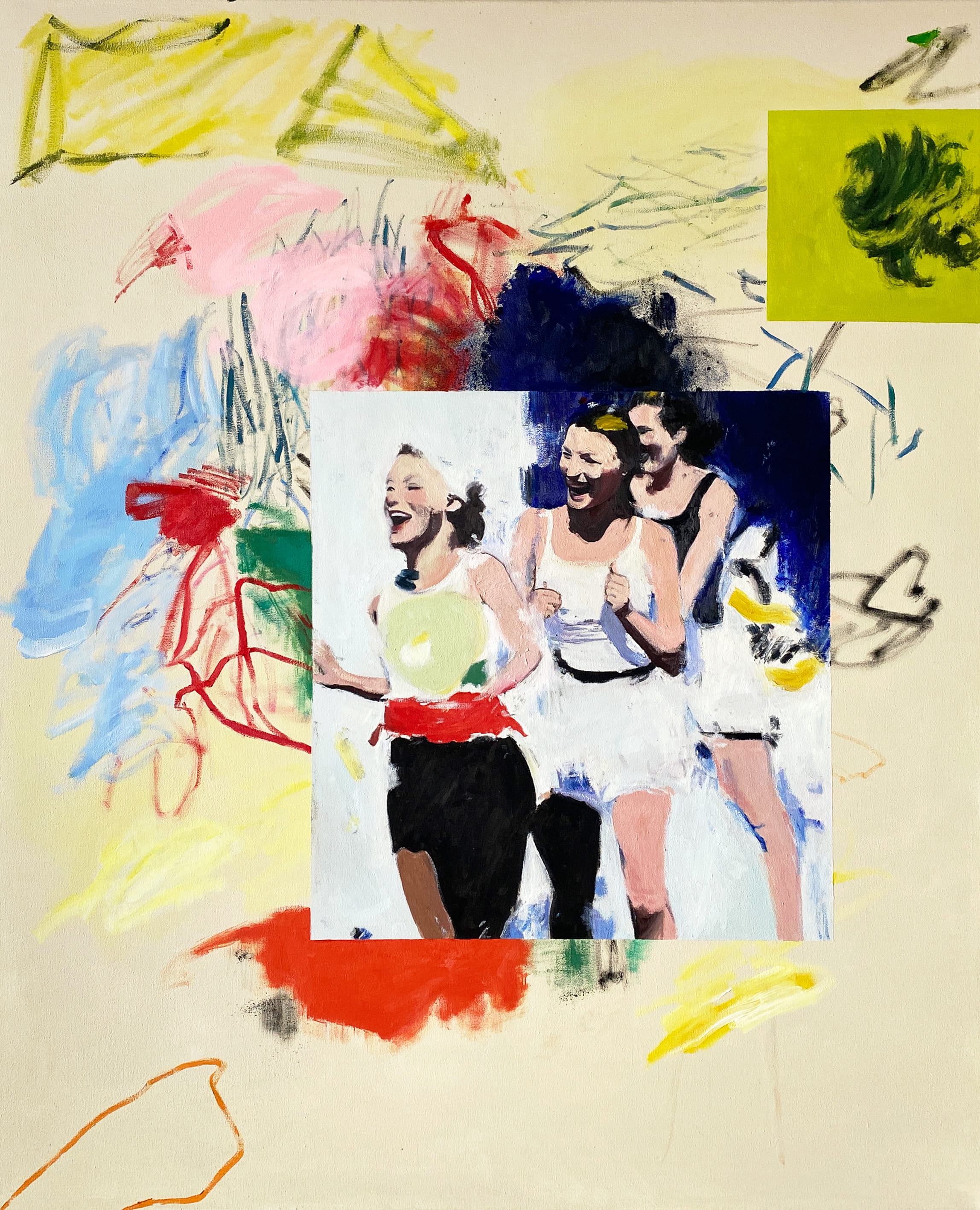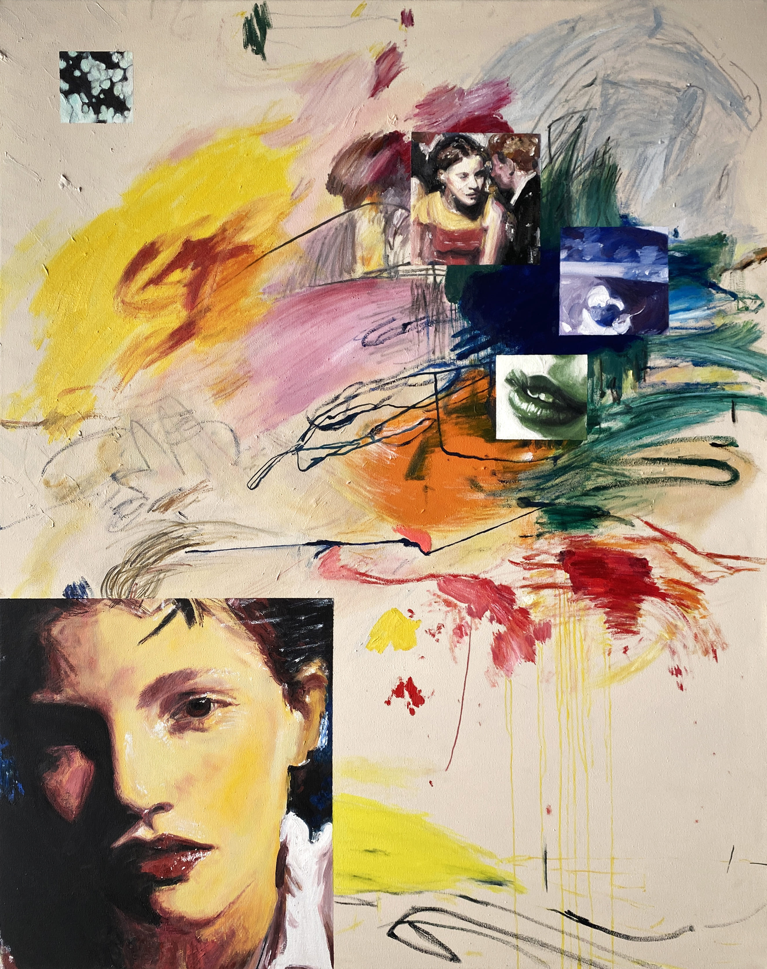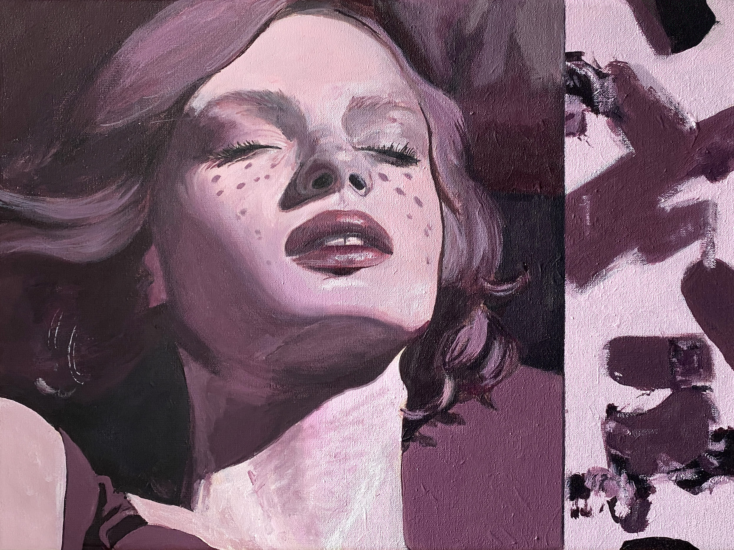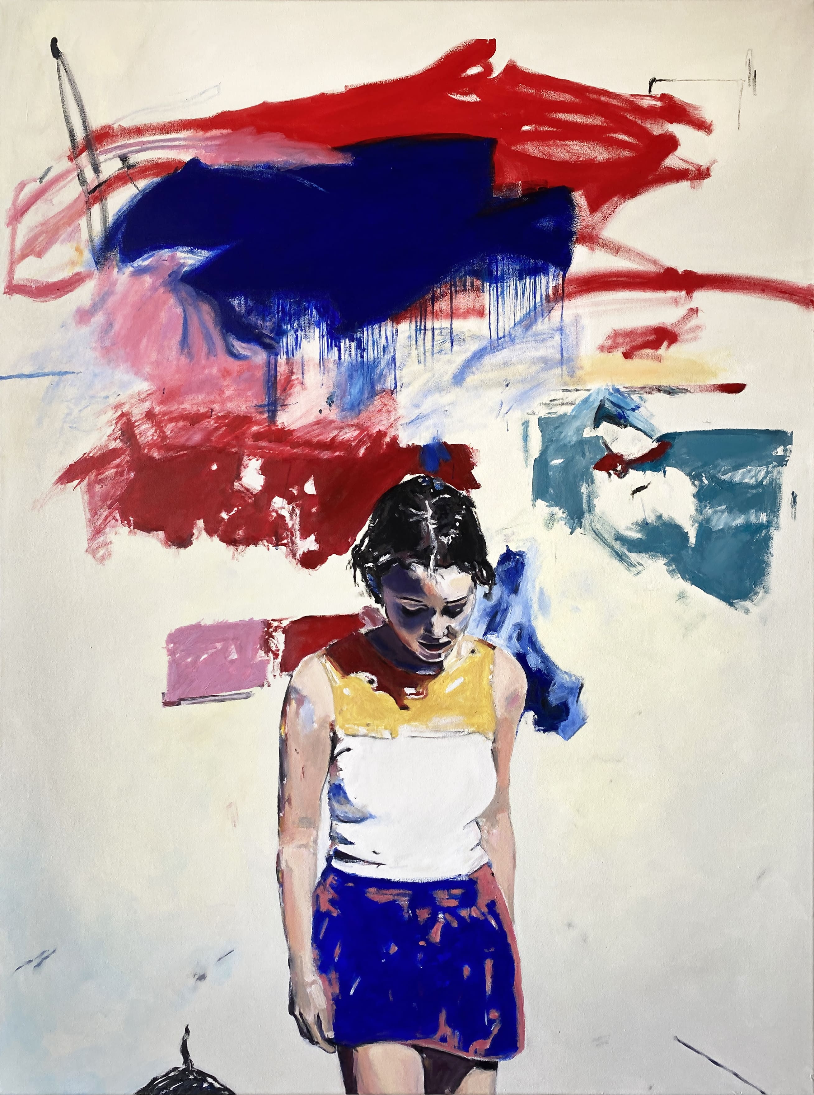 The use of acrylics, oils and pastels, adds texture and energy. Featuring full-body representation interacting with expansive abstract backgrounds, while others shift to medium shots and close-ups, fostering a more intimate connection. Her canvases are an active stage for this exchange, sustaining each other, resulting in a painting that feels alive.