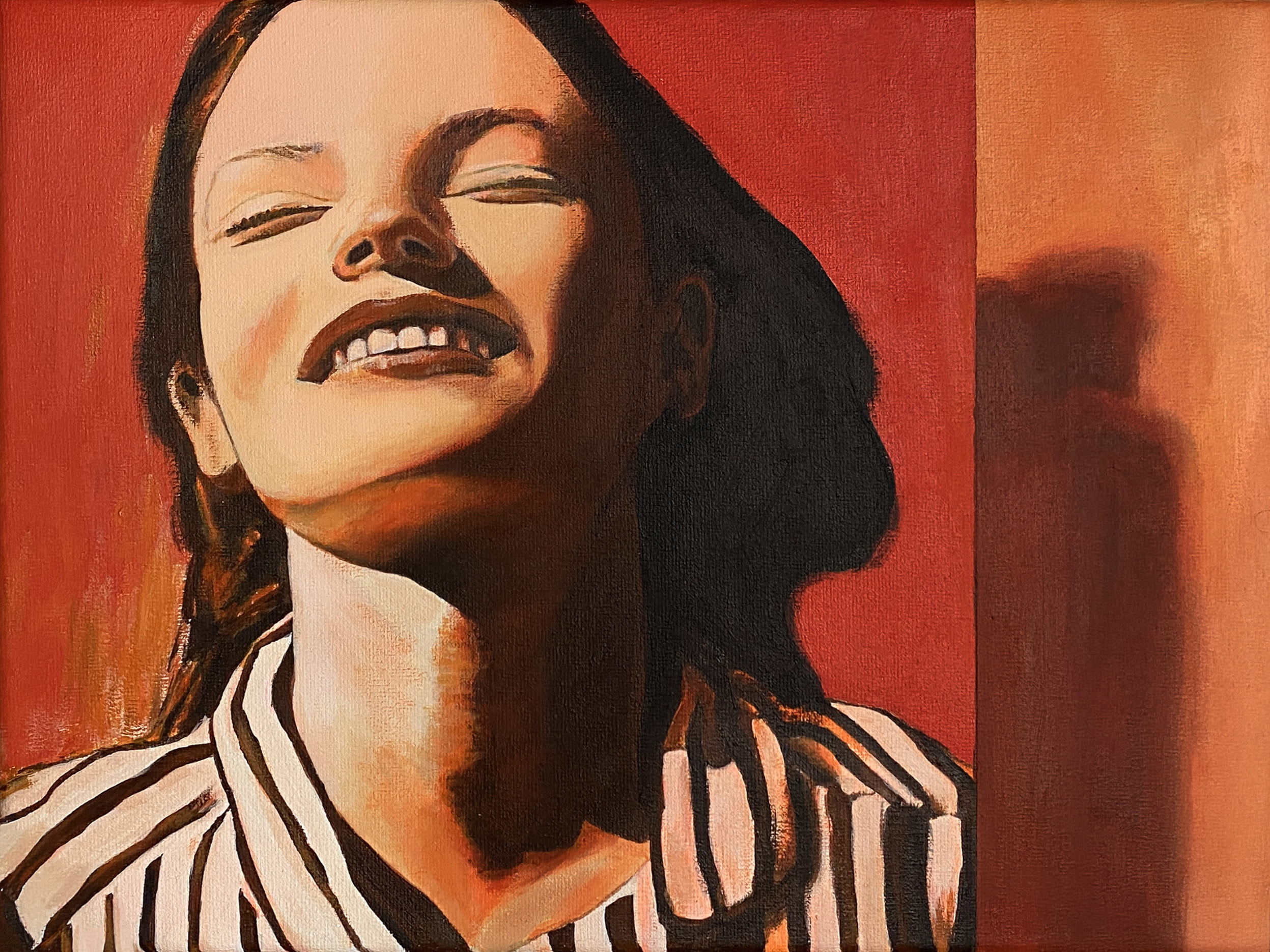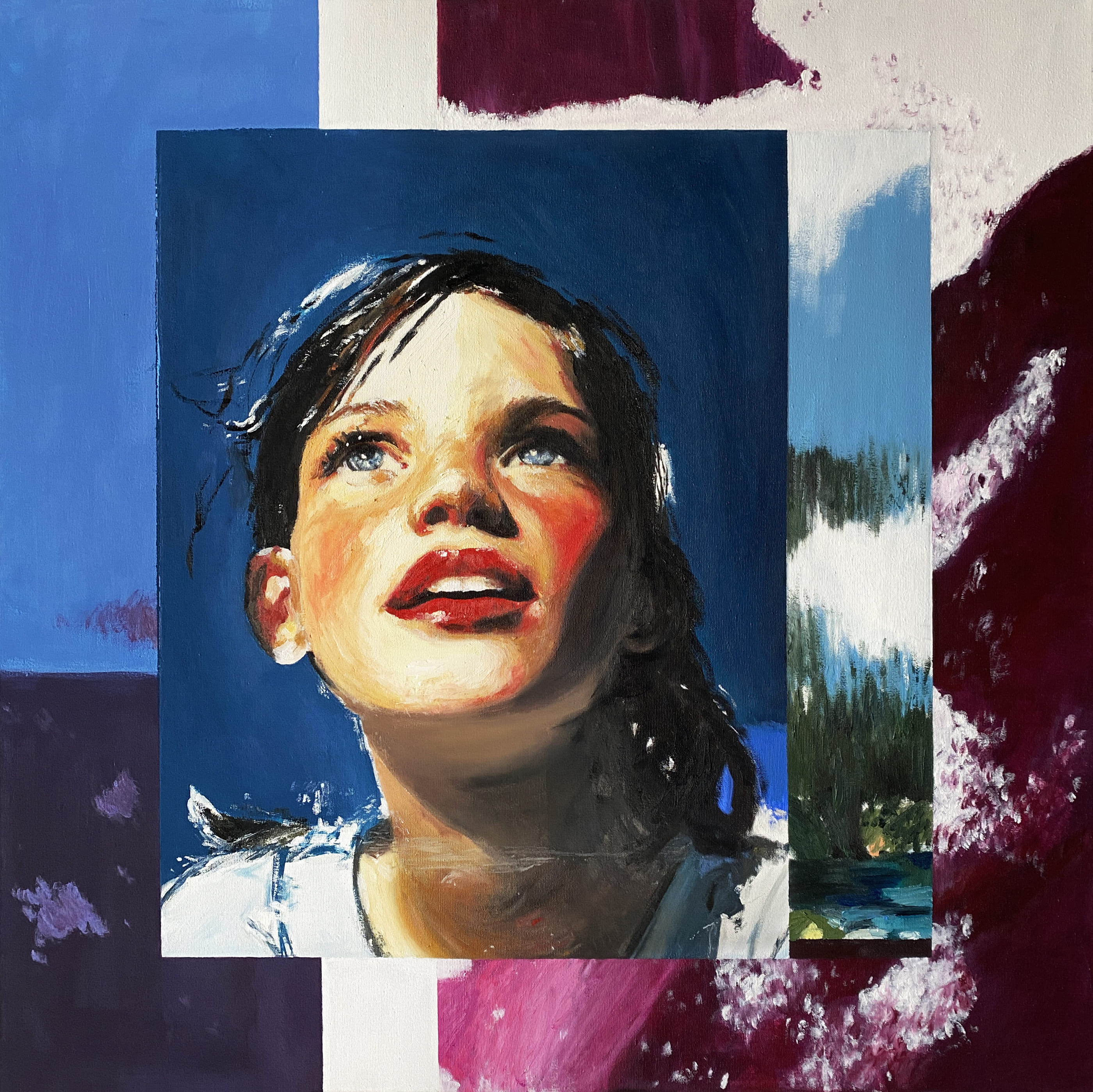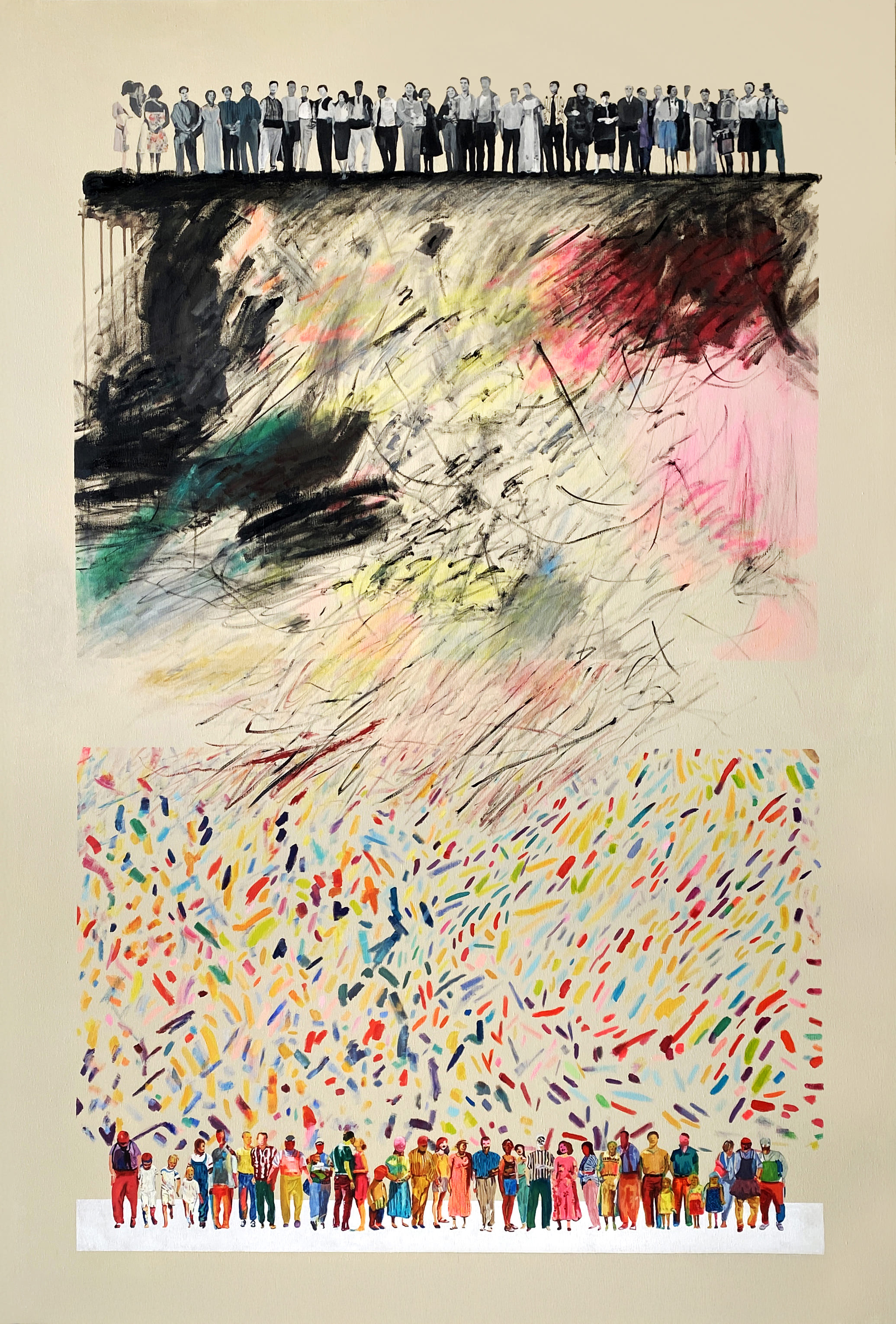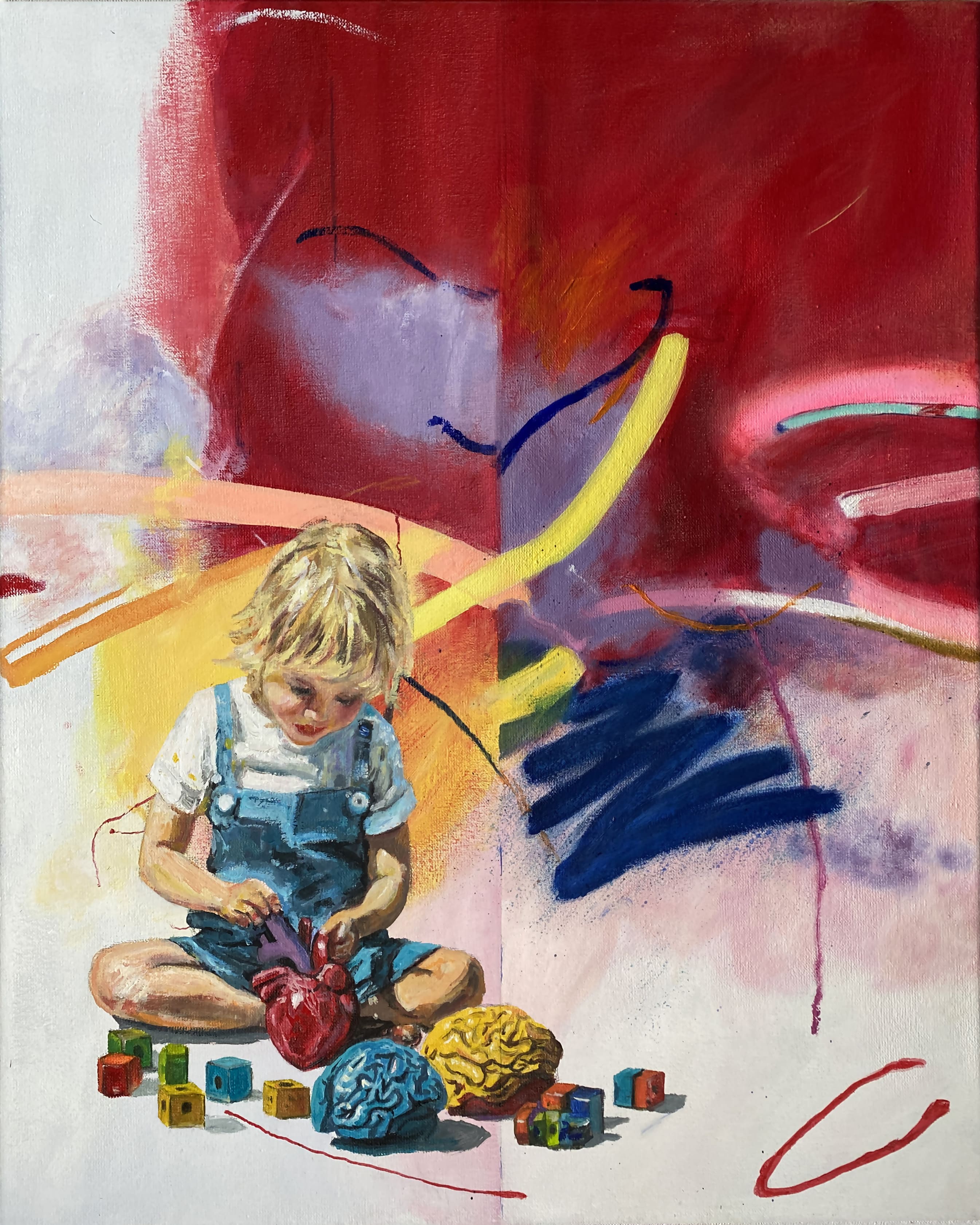 The use of acrylics, oils and pastels, adds texture and energy. Featuring full-body representation interacting with expansive abstract backgrounds, while others shift to medium shots and close-ups, fostering a more intimate connection. Her canvases are an active stage for this exchange, sustaining each other, resulting in a painting that feels alive.
