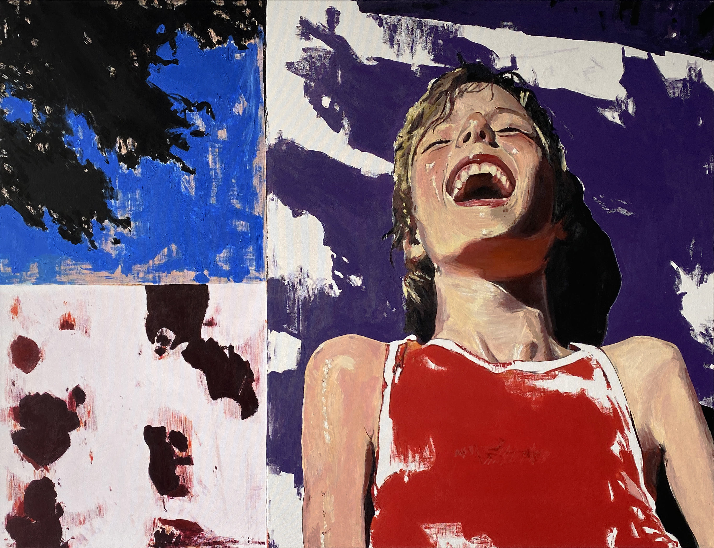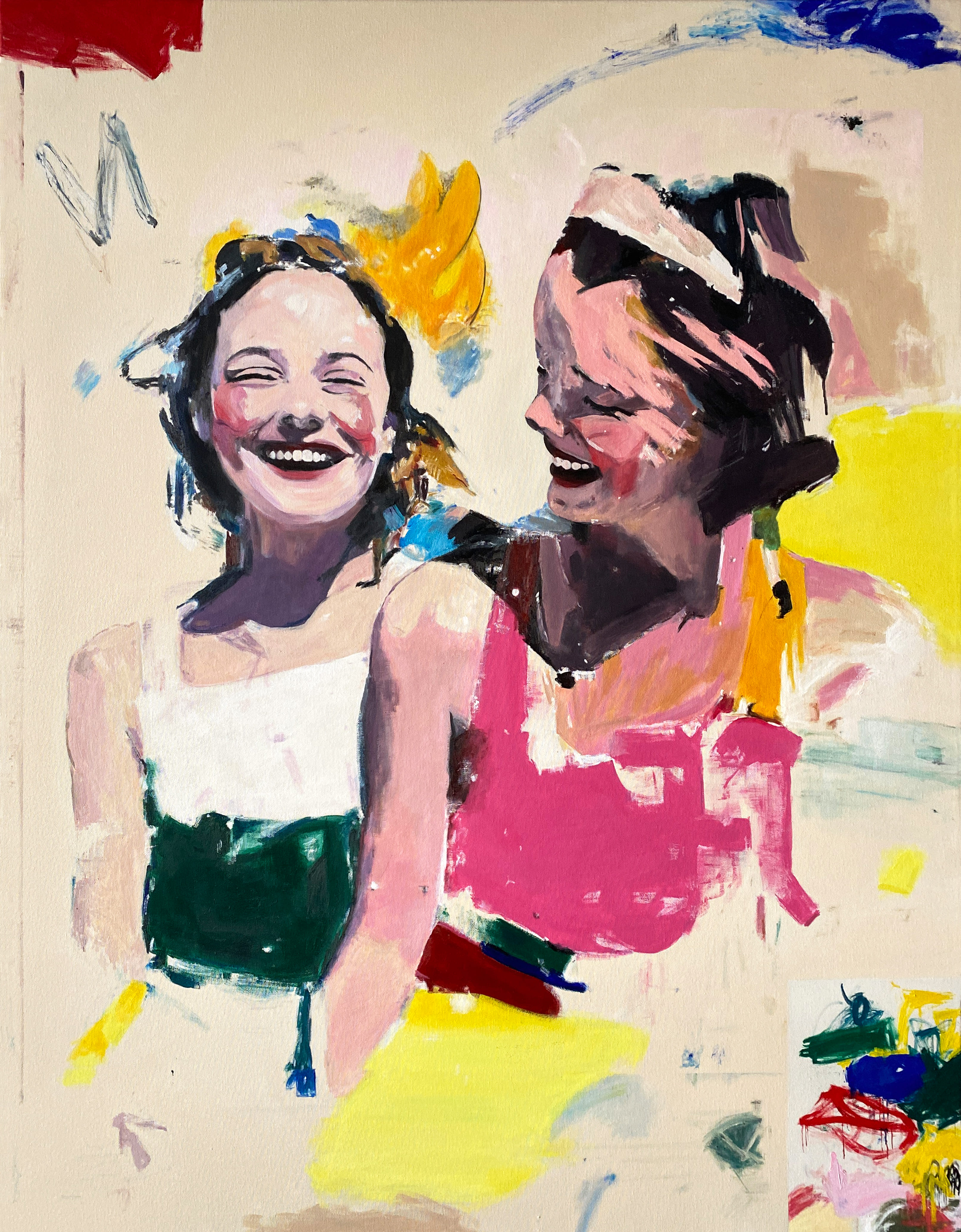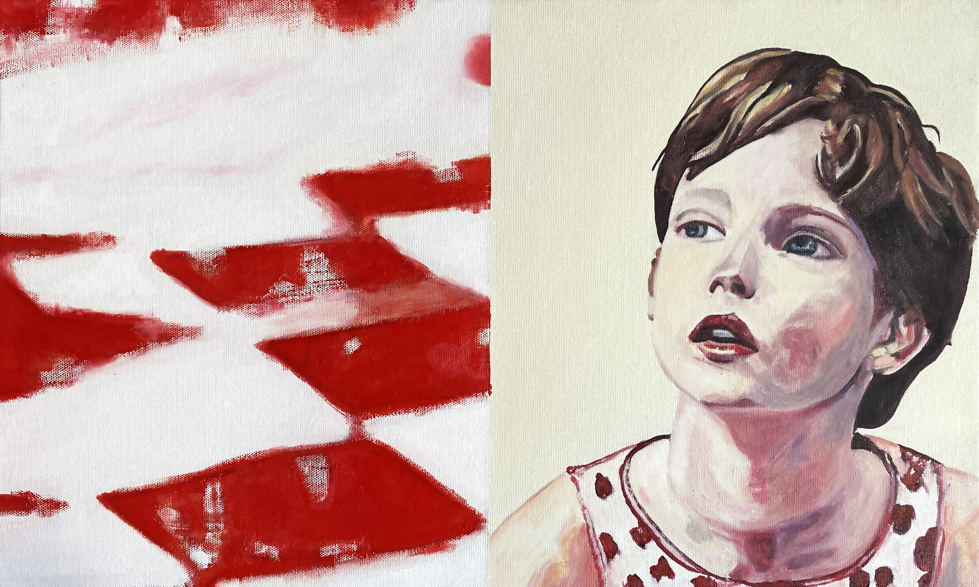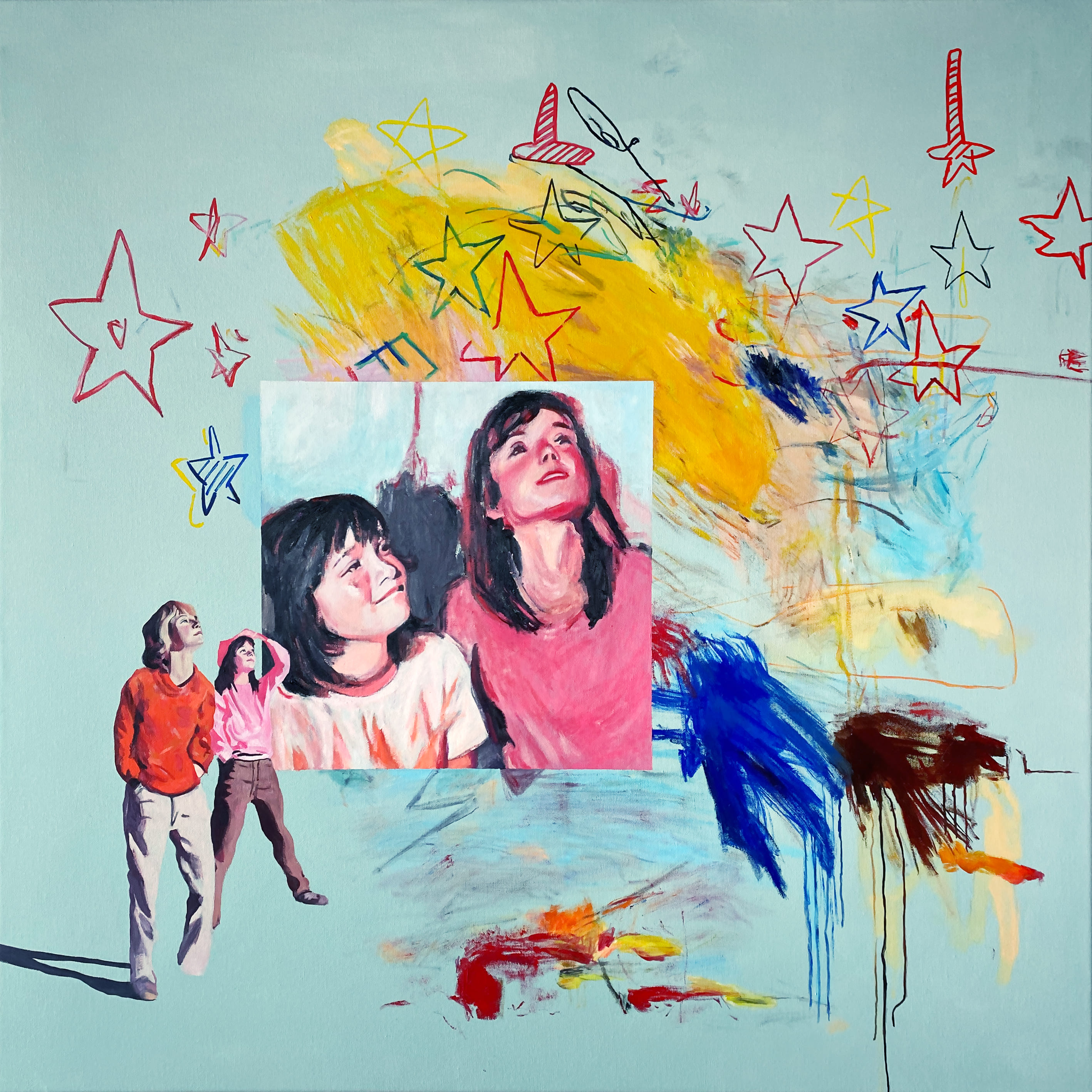 The use of acrylics, oils and pastels, adds texture and energy. Featuring full-body representation interacting with expansive abstract backgrounds, while others shift to medium shots and close-ups, fostering a more intimate connection. Her canvases are an active stage for this exchange, sustaining each other, resulting in a painting that feels alive.