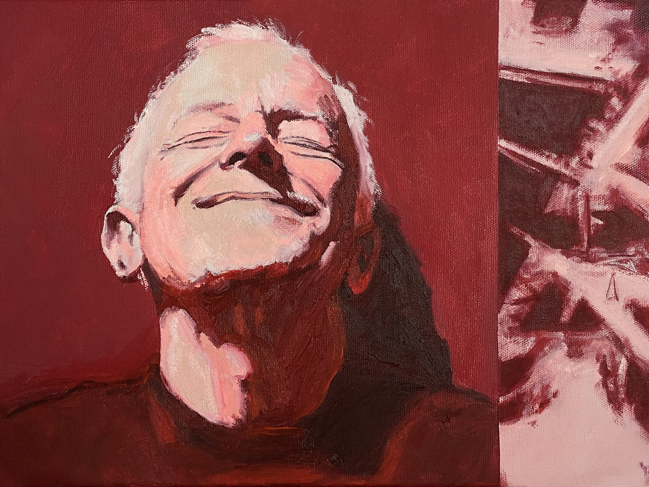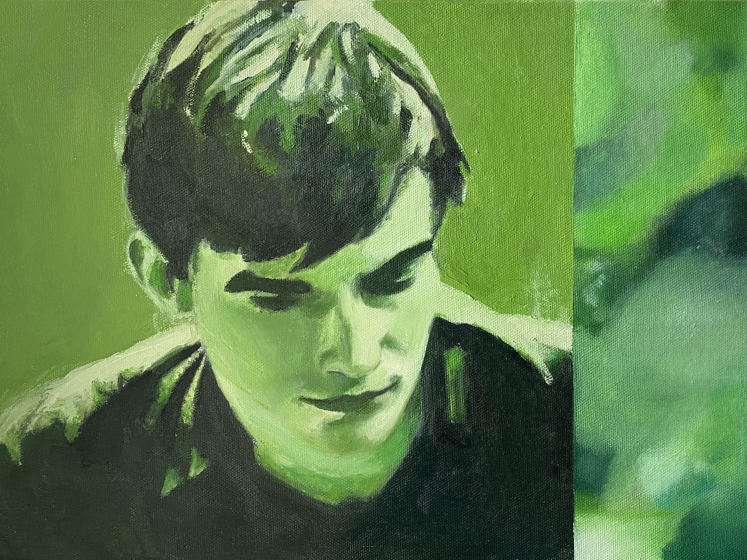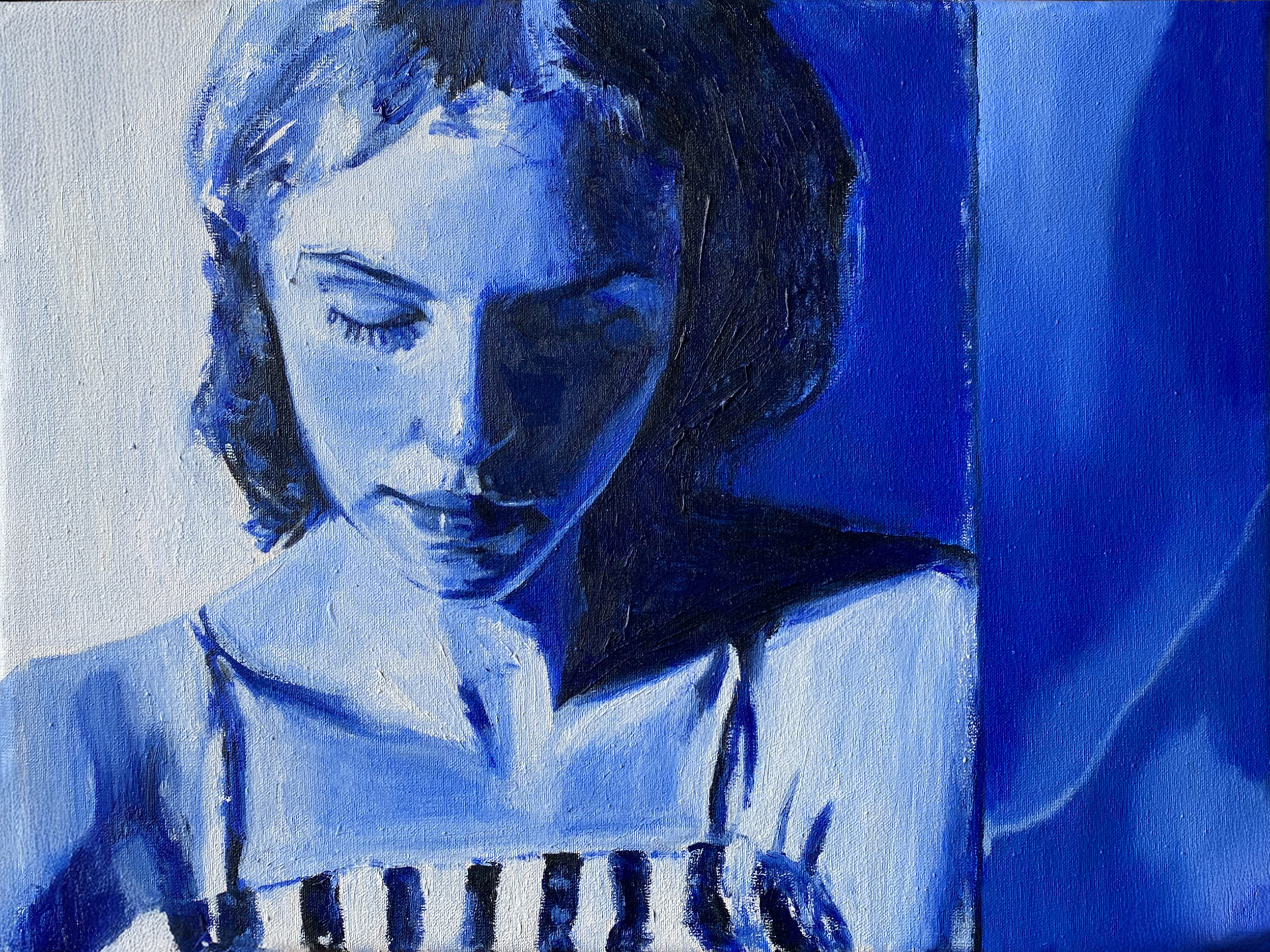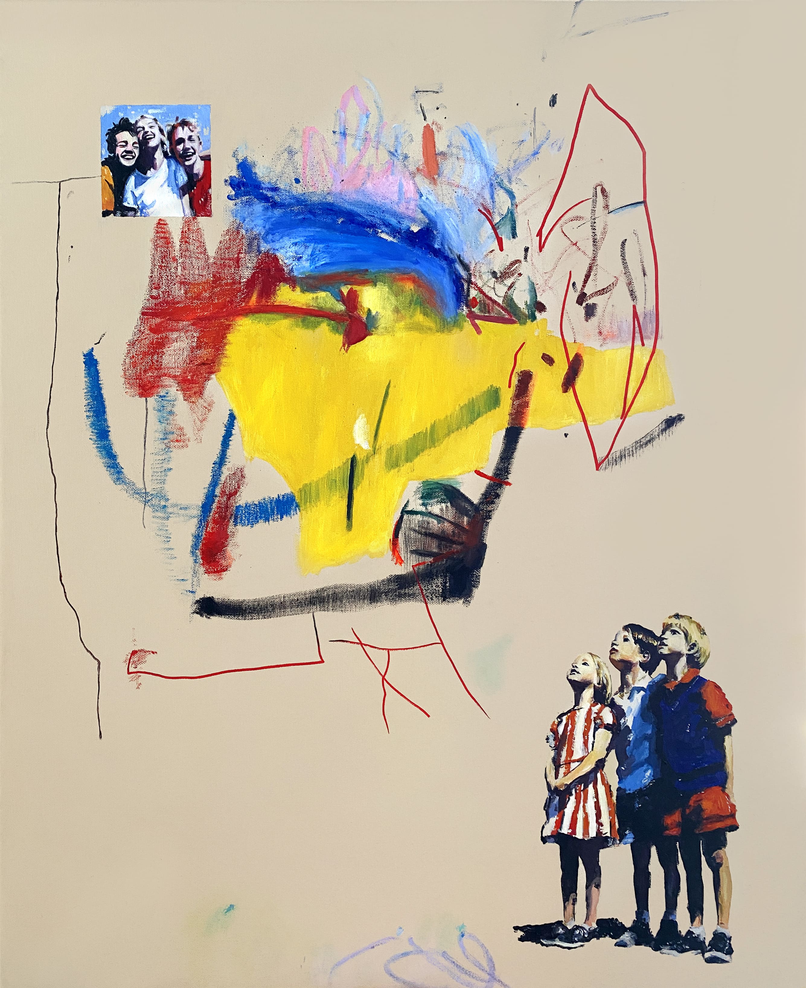 The use of acrylics, oils and pastels, adds texture and energy. Featuring full-body representation interacting with expansive abstract backgrounds, while others shift to medium shots and close-ups, fostering a more intimate connection. Her canvases are an active stage for this exchange, sustaining each other, resulting in a painting that feels alive.